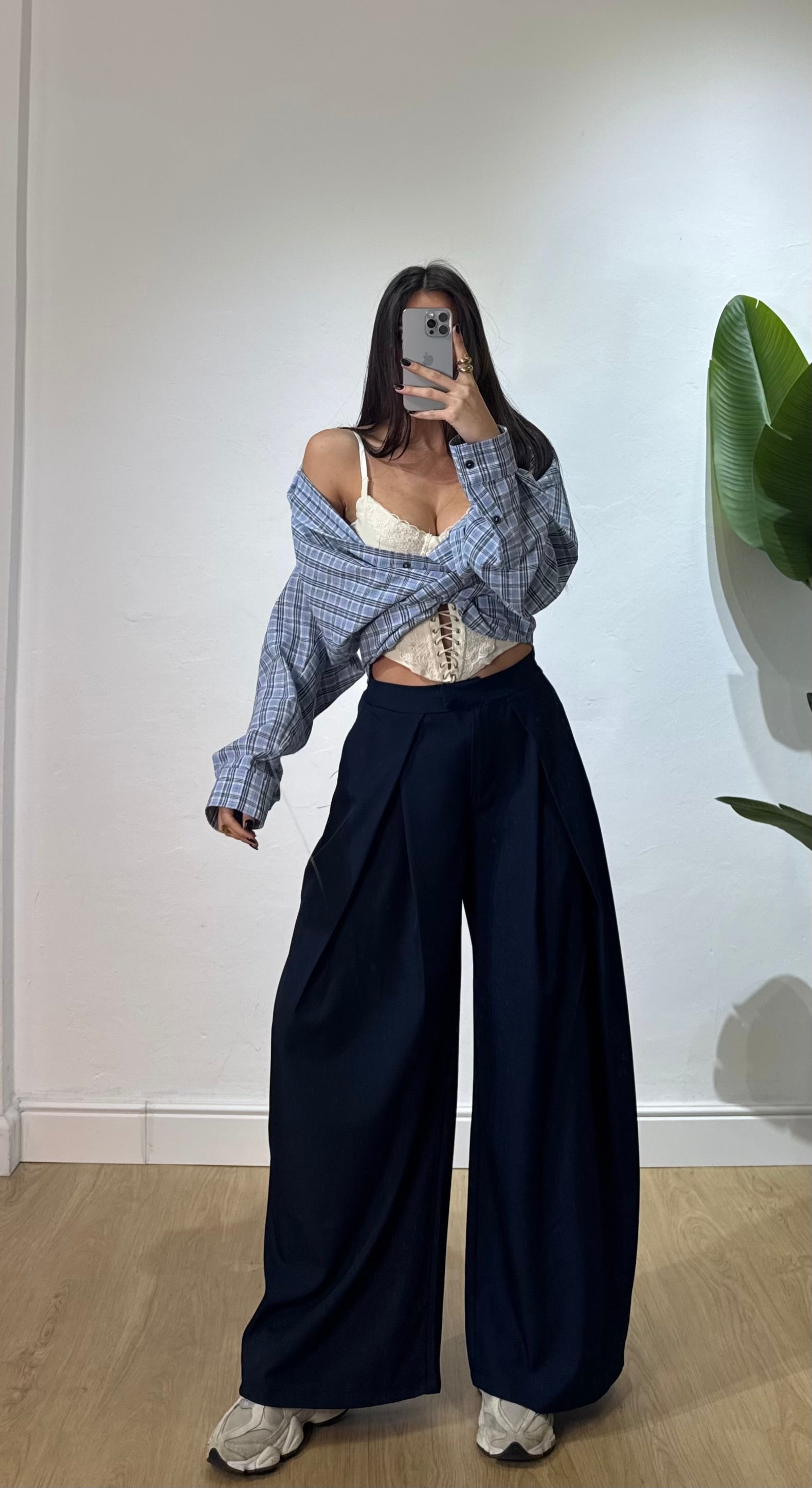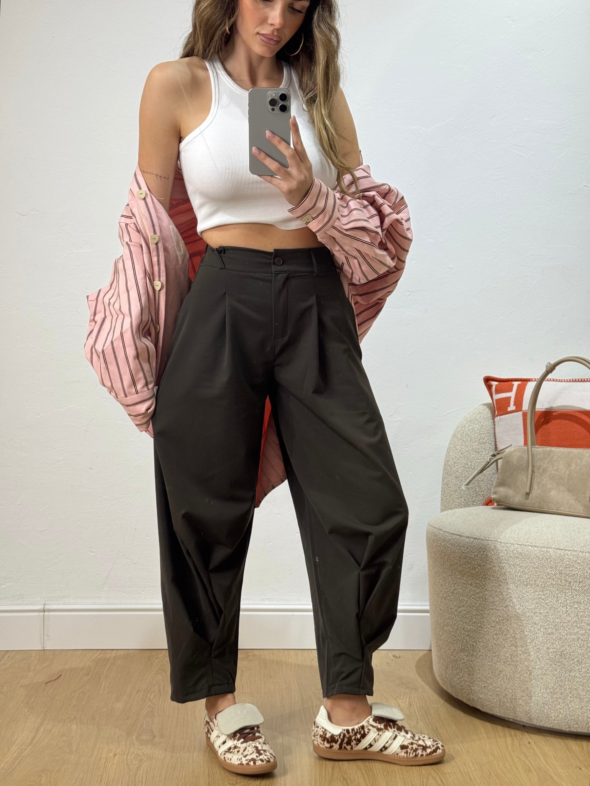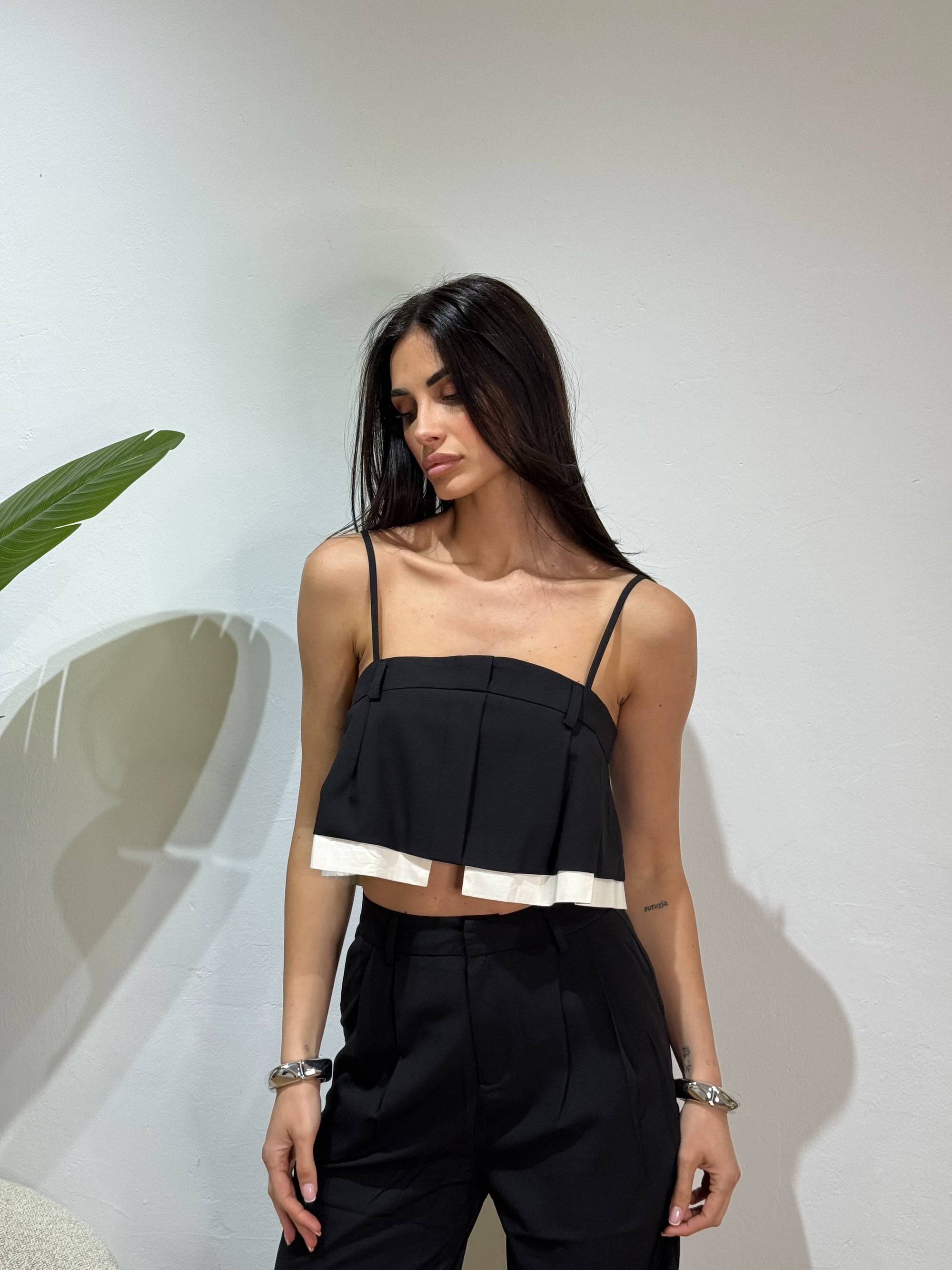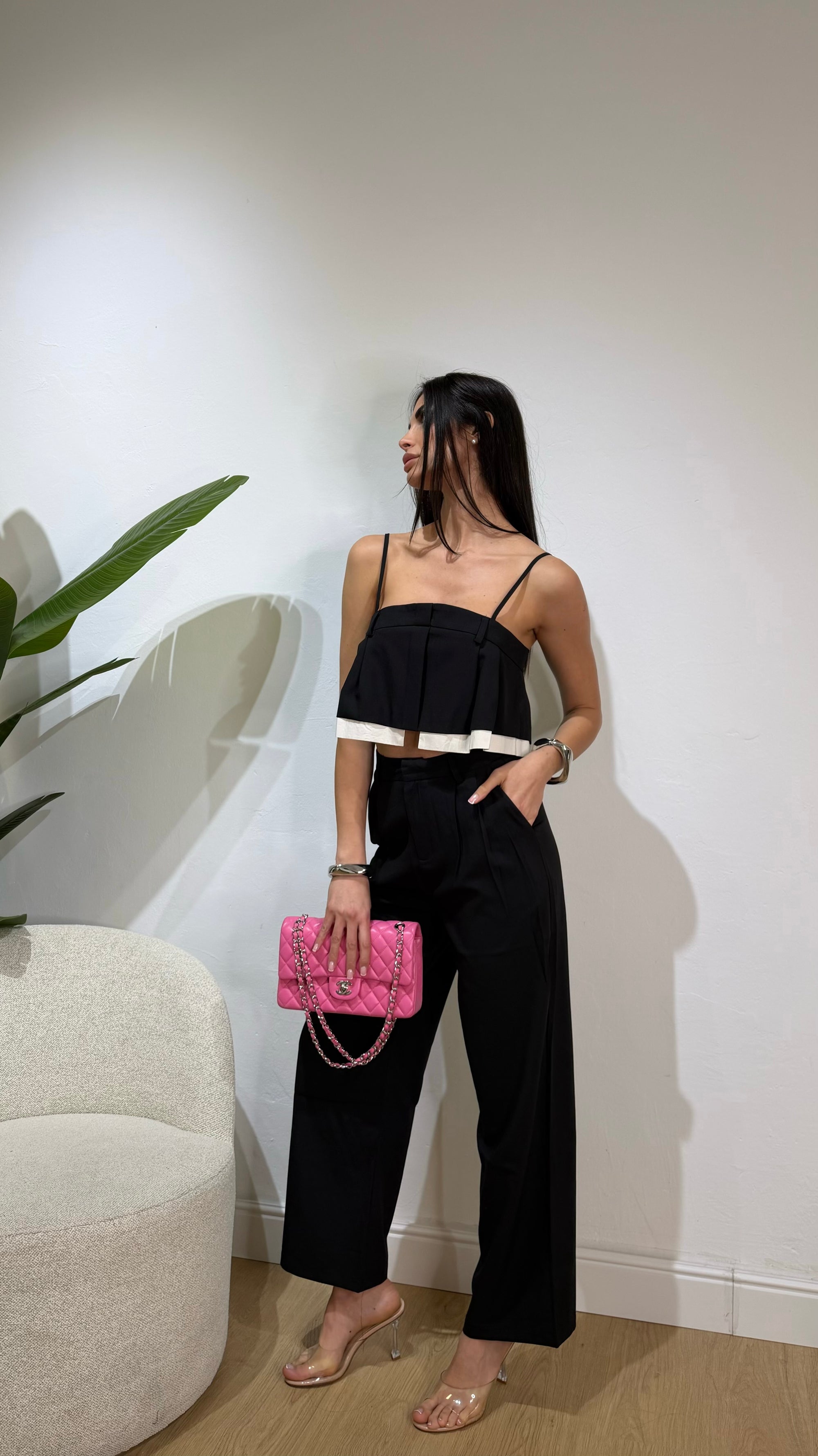 completo composto da canotta crop con bottoncini e pantalone palazzo con elastico in vita.
